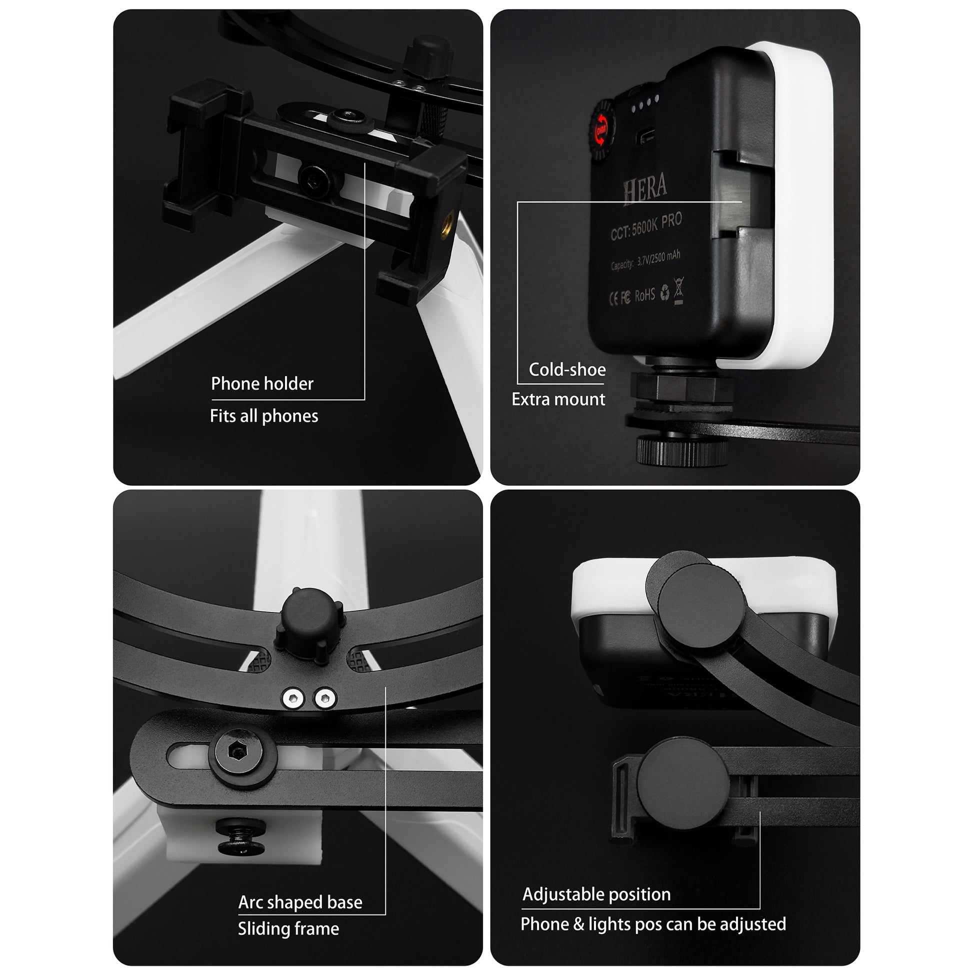 - Arc-shaped design of the base provides with best lighting for oral photos and videos.