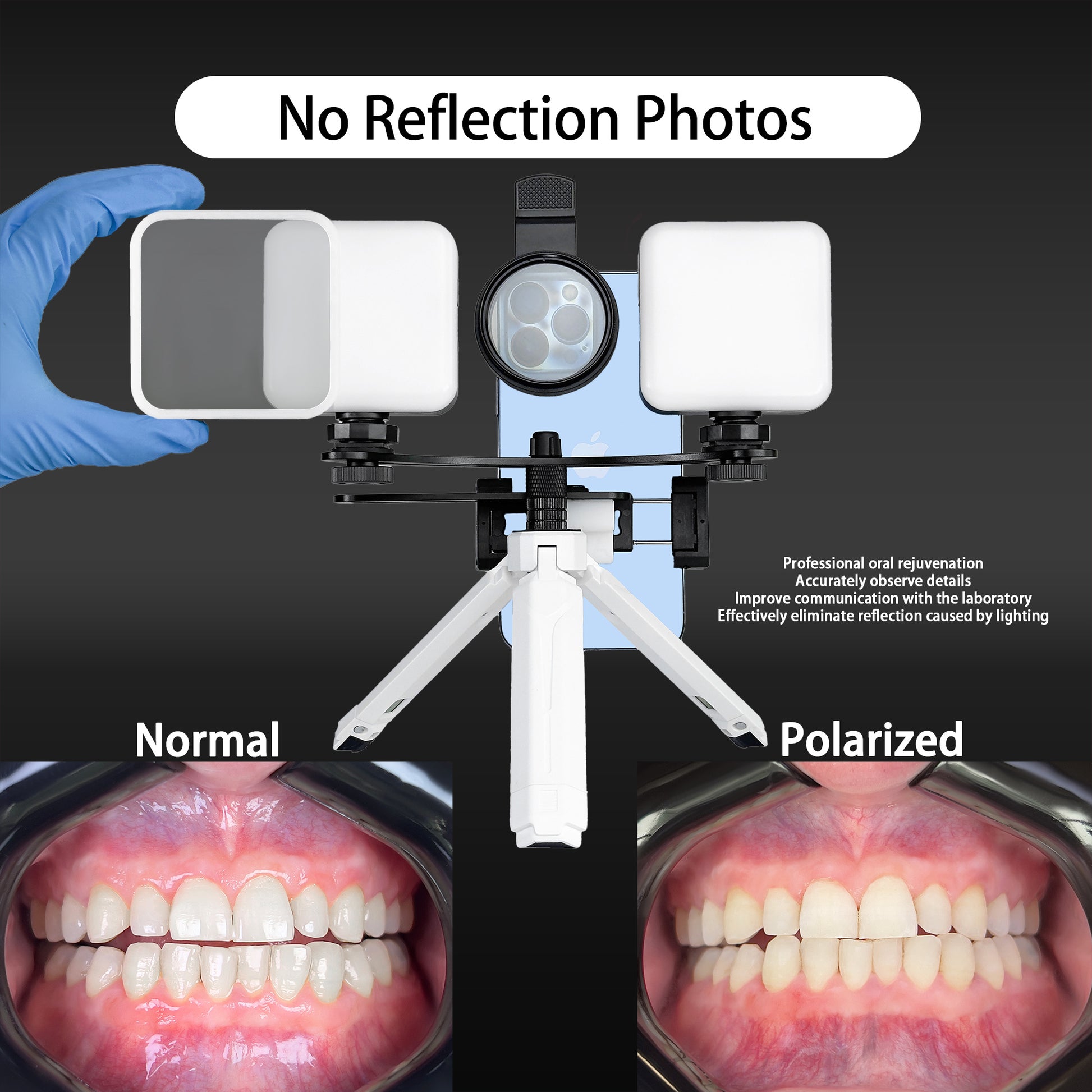 Order the cross-polarization accessories to get photos with no reflections and glare that fit dental photography protocols and helps communication with the lab!