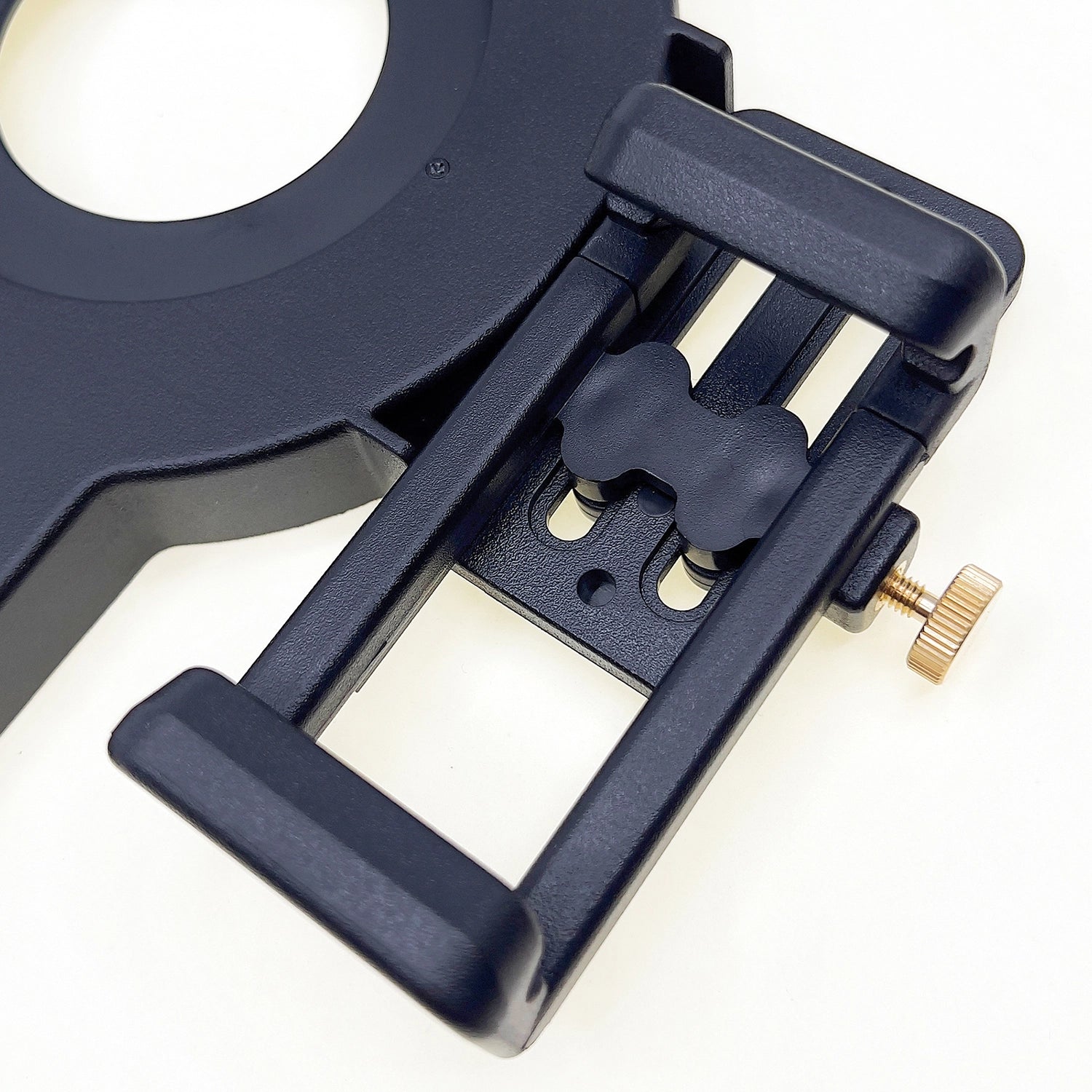 A altura do clipe do telefone pode ser ajustada em qualquer ângulo para que a câmera do telefone fique bem no meio da luz do anel.